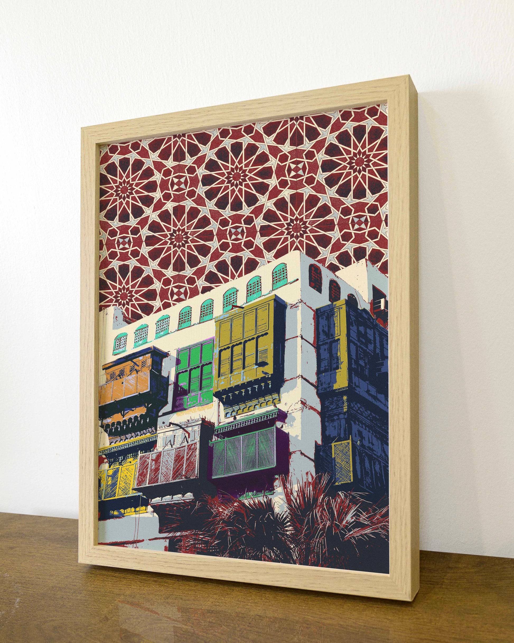 Framed artwork of a building with decorative patterns on a white wall.